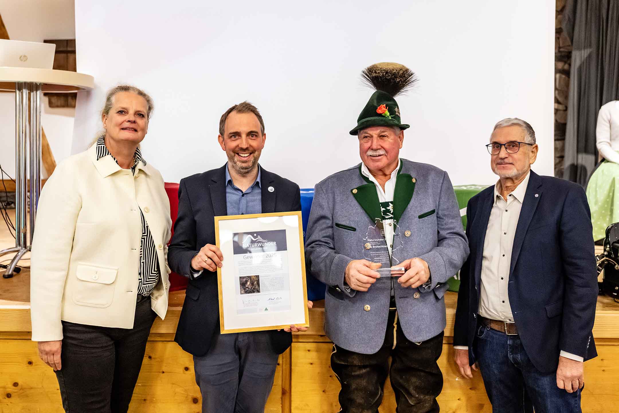 Die offizielle Urkunde und Trophäe für das „Naturwunder des Jahres 2025“ überreichten im Anschluss Carolin Ruh und Werner Mohr, Vizepräsident Deutscher Wanderverband, an Franz Rietzler, Vorstandsvorsitzender der BREITACHKLAMMVEREIN eG, und Betriebsleiter Dominik Fritz.