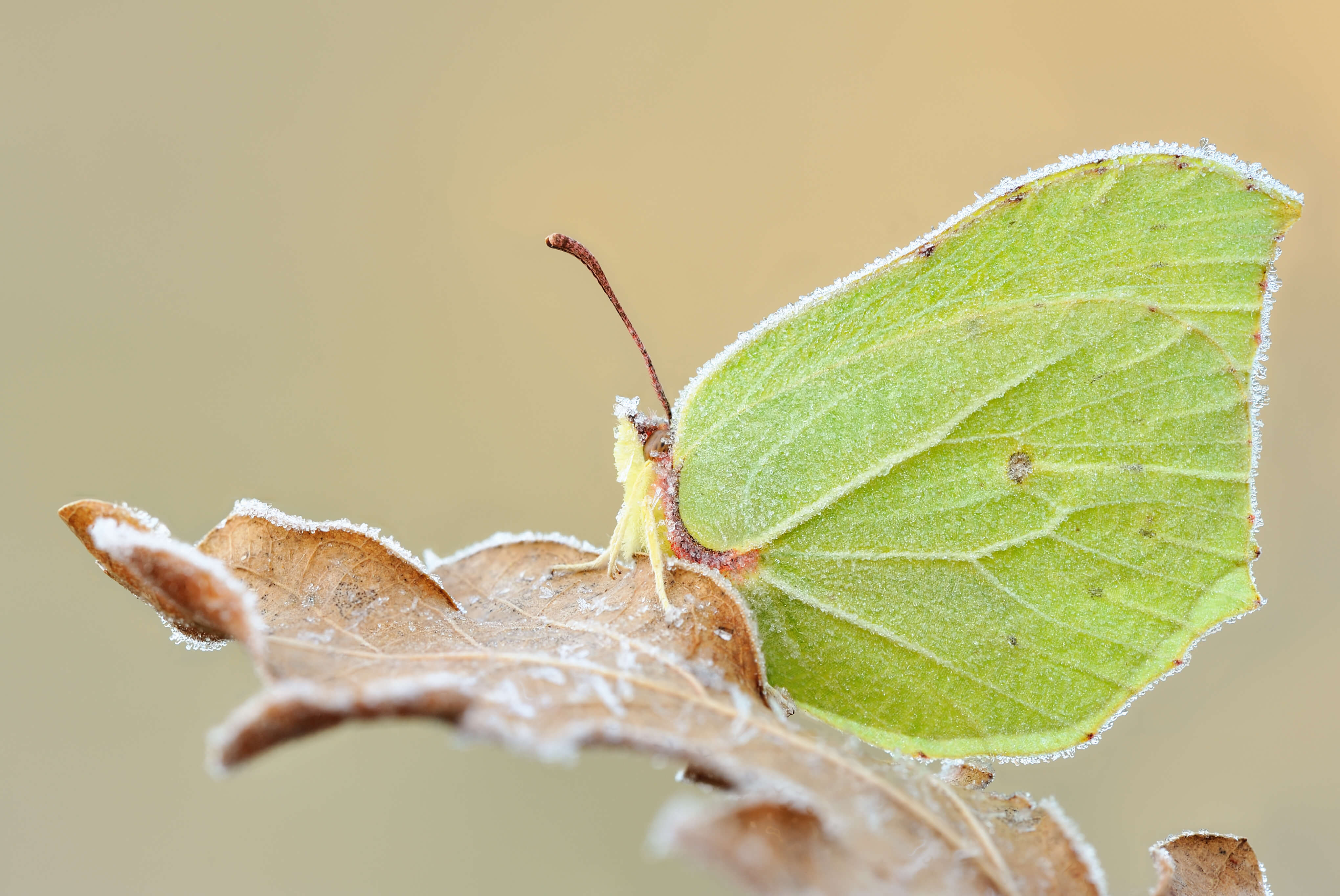 Den Zitronenfalter (Gonepteryx rhamni) kann man selbst bei strengem Frost noch neben glitzernden Schneekristallen auf einem Zweig hocken sehen. Das verdankt er dem Frostschutzmittel Glyzerin, das er in seine Körperzellen einlagert. „Schmetterlinge brauchen die Kälte des Winters, weil die für sie gefährliche parasitäre Pilze abtötet“, sagt Petrischak. Ist ein Winter zu mild, können Puppen, Raupen und erwachsene Tiere regelrecht verschimmeln. Manche Schmetterlingsarten, die als Puppe überwintern, benötigen den Kältereiz sogar als Anstoß für ihre weitere Entwicklung. Dazu zählen etwa Schwalbenschwanz, Grünader-Weißling oder Landkärtchen. Ihre Raupen spinnen sich ein, wenn die Tage deutlich kürzer werden. Die zusätzliche Kälte signalisiert, dass der Winter kommt – und wieder geht. Bleibt es zu mild, fehlt dieser „Schalter“ und die Puppe verbleibt in ihrer Gestalt.