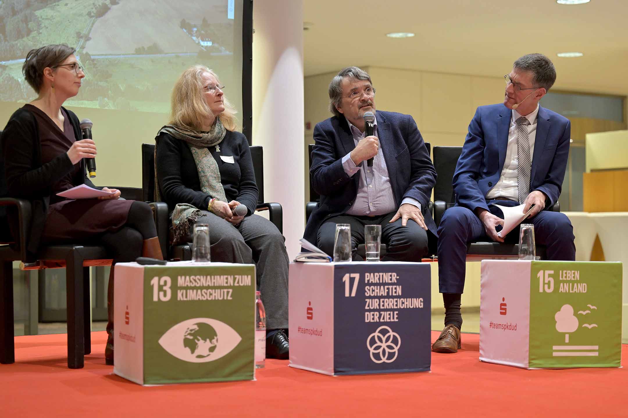 Im Anschluss diskutierten Mira Keune, Geschäftsführerin des Grenzlandmuseums Eichsfeld, und Jochen Paleit, Vorstandsvorsitzender der Heinz Sielmann Stiftung, gemeinsam mit Prof. Dr. Kai Frobel, Initiator des Grünen Bandes Deutschland, und Dr. Alexandra Kruse, Referentin für das Projekt „Auf dem Weg zum Welterbe – Der Natur- und Kulturraum Grünes Band“, über die Perspektiven und Potenziale einer gemischten Welterbestätte Grünes Band.